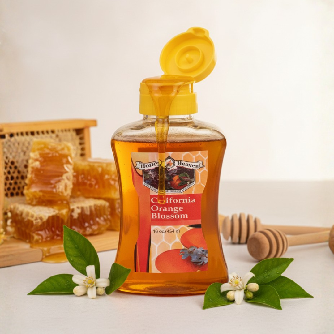 California Orange Blossom Honey straight from the honeycomb. The bees created this honey while enjoying the sweet scent of orange blossom nectar from a huge California Orange Grove. With this delicate flavor of citrus/oranges, it makes the perfect substitute for cane sugar in your food, tea or coffee. Â